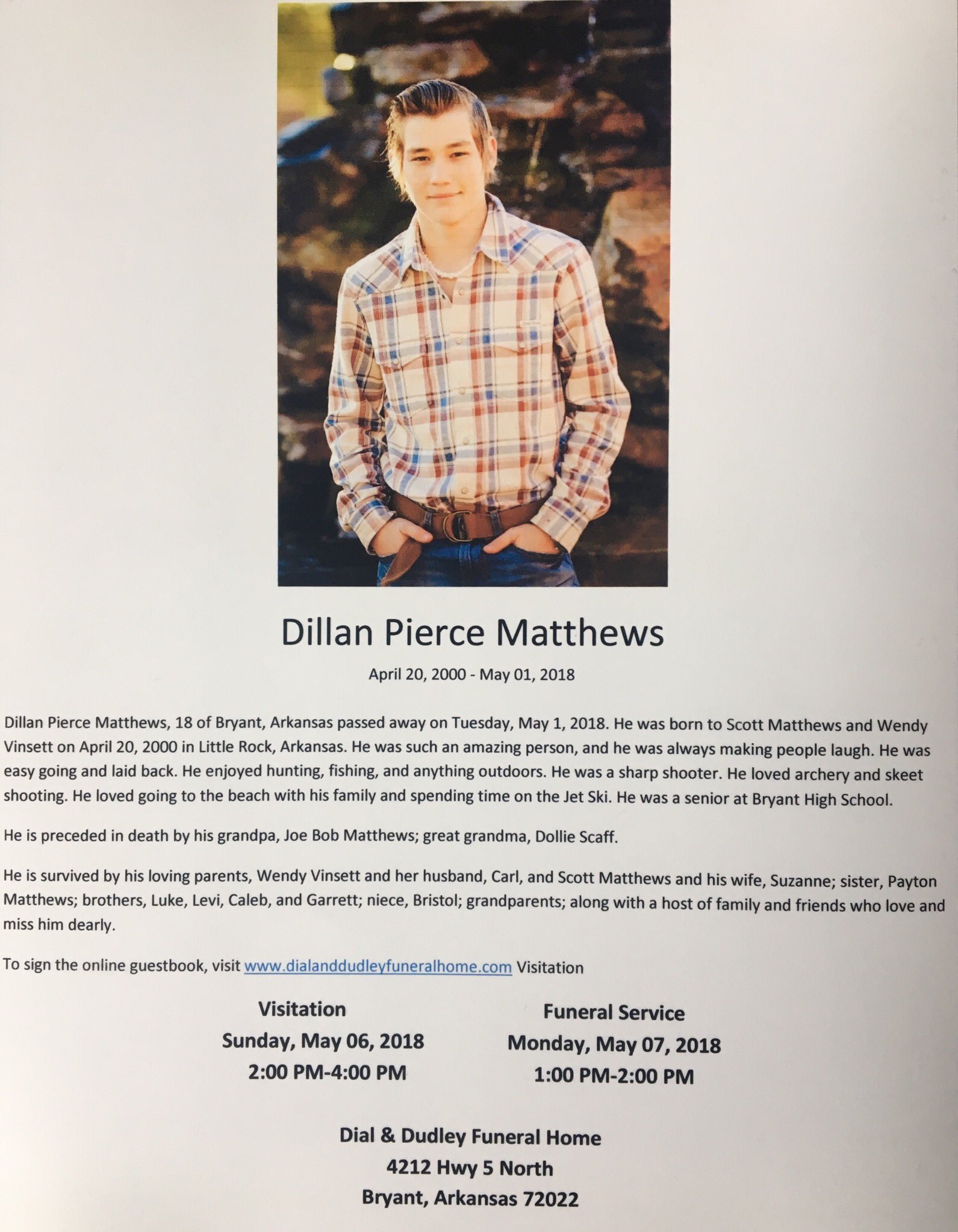Bryant High School On Twitter Please Join Us In Honoring The Life Of Senior Dillan Matthews Who Passed Away May 1 Visitation Is Sun May 6 From 2 4 P M And Funeral Is
